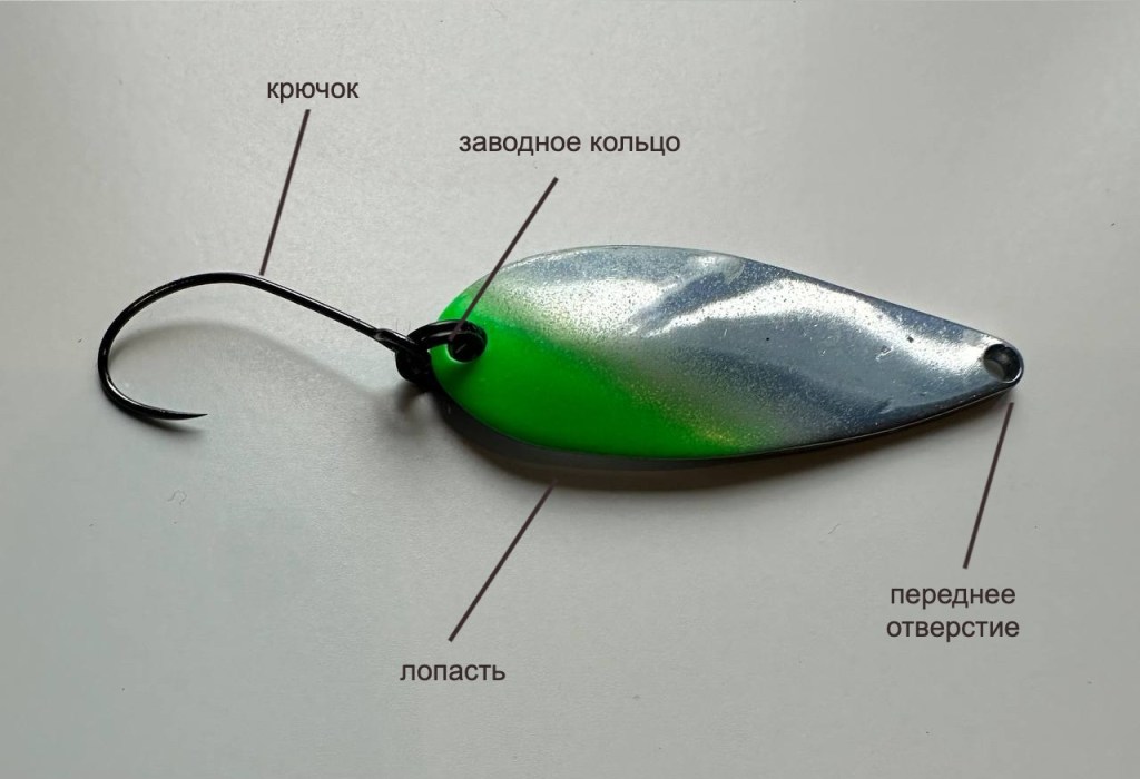 Основная часть блесны называется лопасть, именно за счёт неё она плавает в воде. Переднее отверстие предназначено для крепления блесны к застежке, заднее отверстие соединено с заводным кольцом, которое держит крючок.