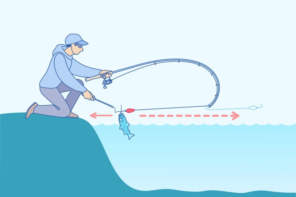 После поимки рыбы нужно подмотать леску так, чтобы между концом удочки и рыбой был участок длиной примерно 30 см. Такая длина лучше всего подходит на этапе обучения.