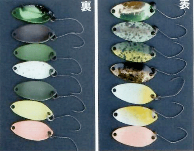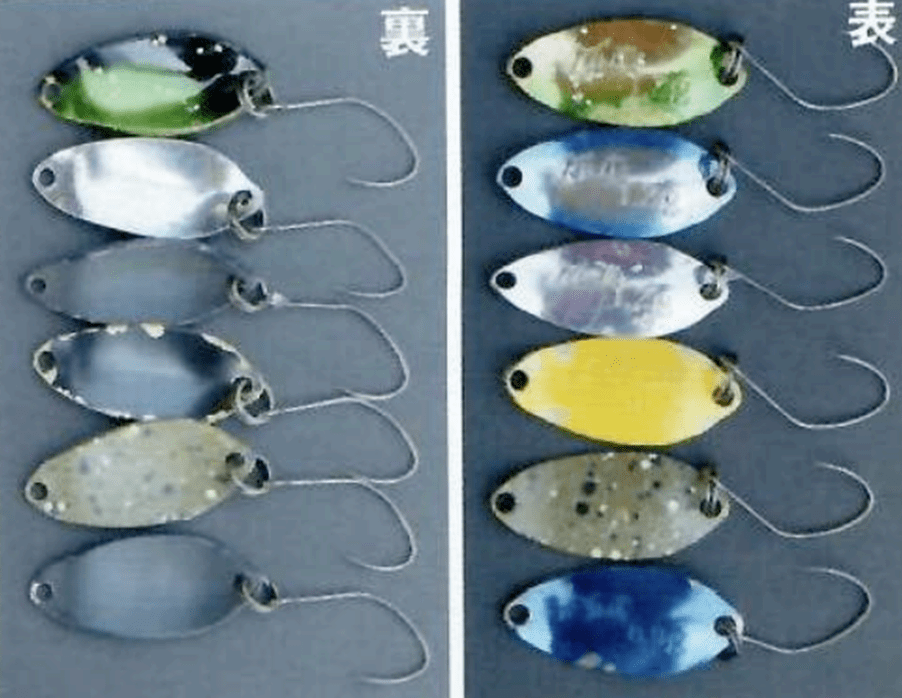 Цвета на изображении выше чаще всего использую на водоёме в Оашигава. Там чистая вода, поэтому такие цвета, как синий на серебре, UV с чёрной подложкой, синий на чёрном, зелёный на золоте работают лучше других.