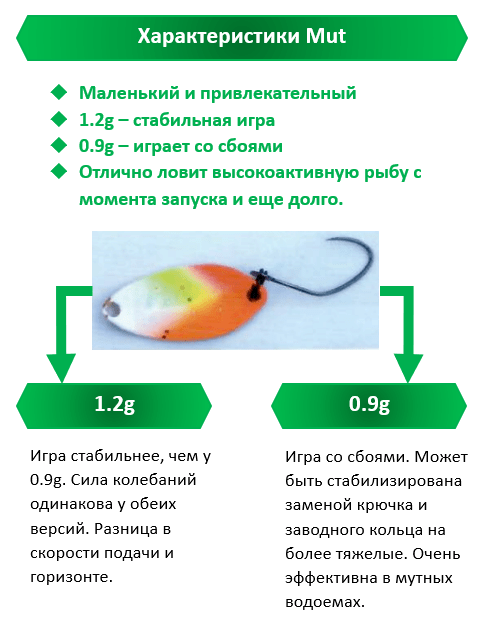 Во время зарыбления на малых и средних водоемах, когда Mut 1.2g покрывает значительную ширину пруда, я стартую именно с этого веса. Эта блесна меньше обычной стартовой блесны, её длина 20 мм. При этом Mut имеет довольно привлекательный силуэт. Блесна обладает стабильной игрой, которая ближе к роллингу, и хорошо держит горизонт.