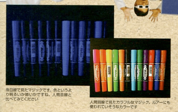 Для этого использовалась специальная пленка Komaya Eye, позволяющая увидеть цвет с точки зрения рыбы. Чтобы испытать это на себе — посмотрите на картинку ниже.