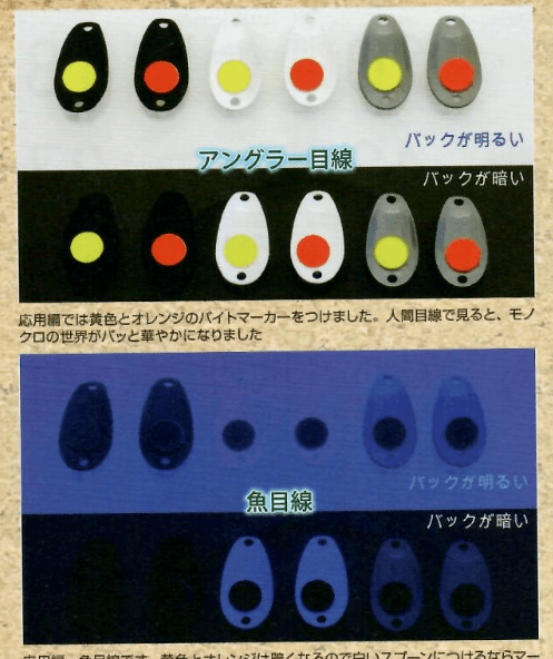 С другой стороны, с точки зрения рыбы, светлый фон, белая блесна и желтый или оранжевый маркер выделяются как силуэт икры лосося. Этот маркер также хорошо работает на тёмном фоне, представляя собой чёрный круг на белом фоне. Однако с чёрной или серой блесной цвет маркера совсем не выделяется и не выполняет свою функцию.